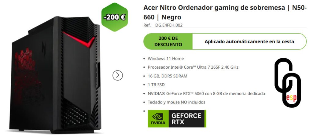 Si buscas el máximo rendimiento en 2K, el Acer Nitro N50-660 es tu mejor aliado. Es una bestia compacta diseñada para mantener FPS altos en ajustes Ultra sin despeinarse. Comprando directamente en la Tienda Oficial de Acer te aseguras el precio más bajo, stock real y el mejor soporte del fabricante. ¡Potencia pura sin intermediarios!